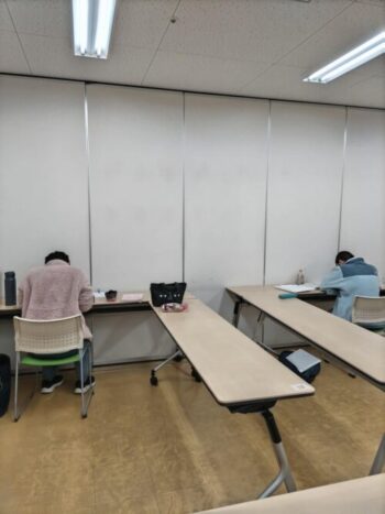 1人2台のテーブルをLの字に準備し、一人のスペースを広く、テーブルも参考書、